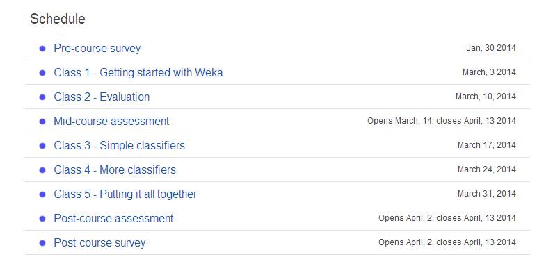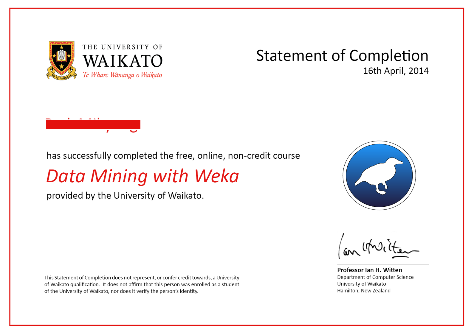 데이터마이닝 관련 논문 자료를 찾다가 뉴질랜드 Waikato 대학교에서 제공하는 오픈코스(MOOC) Waikato Course를 알게 되었다. 3월부터 수강하는 기간이라 하였기에 잘 기억하고 있다가 학기가 시작할 때 같이 신청했다. '데이터마이닝 강좌 수강 완료하기'는 2014년 나의 연간 계획 중 하나가 됐다.