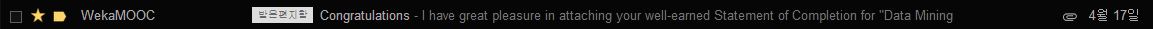 Data Mining Weka는 수강기간이 아니어도 오픈되어있으며 자막과 강의록도 다운받을 수 있다.(http://www.cs.waikato.ac.nz/ml/weka/mooc/dataminingwithweka/) 어차피 들을거면 Certification 받 추가로 후속편으로 More Data Mining with Weka 강의가 진행 중이다. 이것은 심화 과정으로 Data Mining with Weka 강의를 선행해야지만 수강할 수 있다. 마저 열심히 들을 예정이다.