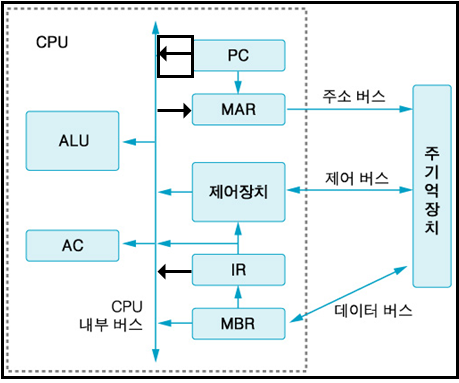 o Memory Address Register(MAR, 기억장치주소 레지스터) : 다음에 수행 될 명령어를 인출하기 위해 현재 PC에 들어있는 내용(주소)이 시스템 주소버스로 출력되기 전에 일시적으로 저장되는 주소 레지스터