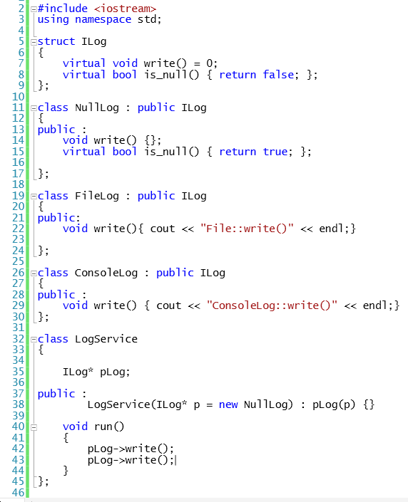 그리고 ILog를 상속받는 NullLog를 만듭니다. 그리고 (부모클래스인 ILog에서 virtual로 구현을 했으니 무조건 구현을 해주어야하지만 하는 일은 없으니) write()를 물려받아 빈 몸체로 만들고, is_null()은 true를 반환하게 합니다.