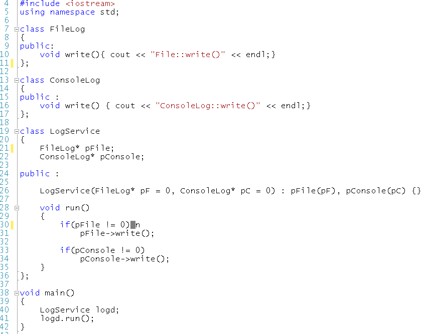 ILog 클래스(인터페이스)를 만들어주고 write()를 순수가상함수로 만들어 자식 클래스에서 기능을 구현하도록 강제할 것이에요. FileLog, ConsoleLog는 모두 ILog를 상속받도록 하구요. 이렇게 하면 25 라인의 LogService에서 28, 29라인 대신 30 라인으로, 34 라인 대신 35 라인처럼 구현할 수 있게 됩니다.