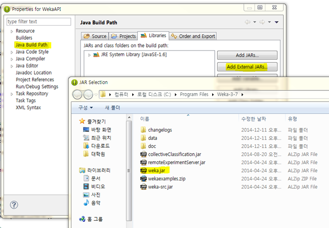 2. 자바 프로젝트 [Properties] - [Java Build Path] - [Add External JARs]에서 weka.jar파일 추가하기
