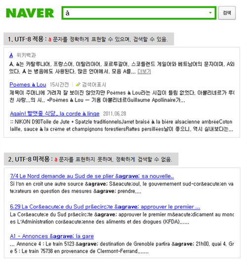 * 네이버 통합검색은 EUC-KR 인코딩 방식을 사용했을 때 깨졌던 문자들을 현대 한글뿐만 아니라 한글 고어, 일본어, 중국어 등 모든 언어의 문자를 처리할 수 있는 UTF-8 인코딩 방식을 도입하여 깨짐을 방지함