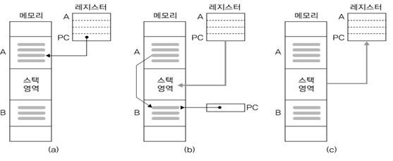 - 스택 영역에 있던 내용을 레지스터에 다시 저장한 뒤, PC를 비롯하여 중단했던 프로그램 A를 다시 시작한다.