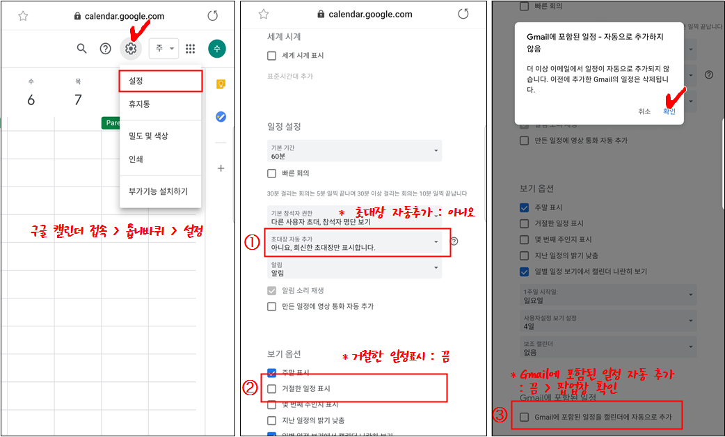 (이전에 추가된 일정을 없애려면 ③번 팝업창에서 확인을 눌러 이전 지메일 일정을 삭제해야한다. 안그러면 일일이 지워야할 듯)
