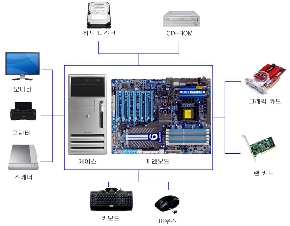 - 주변장치들을 연결하는 확장슬롯과 각종 포트와 단자가 있음