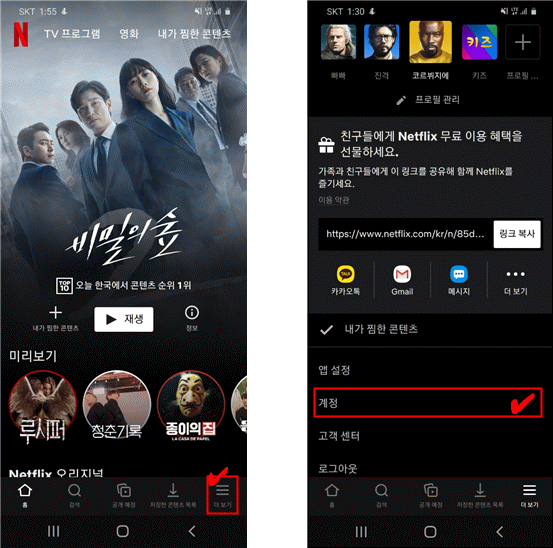 * 넷플릭스 앱에서 더보기 - 계정을 선택하면 웹페이지로 이동하기 때문에 스마트폰과 PC에서 설정 방법은 동일합니다.