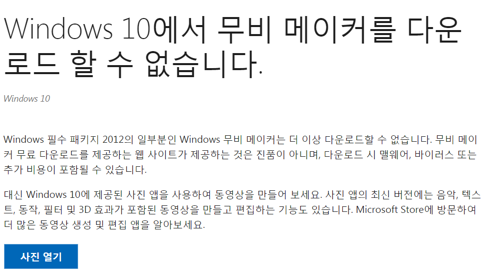 확인해보니 마이크로소프트는 공식적으로 더이상 무비메이커를 다운로드할 수 없다고 선언했다. Windows 필수 패키지 2012를 더이상 다운받을 수 없게되면서 그 일부분인 윈도우즈 무비 메이커 또한 더 이상 다운받을 수 없게 된 것이다. 대신 윈10에서 사진 앱에서 동영상 편집이 가능한가보다.