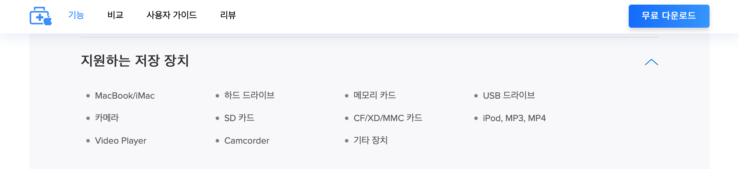 다양한 디바이스 지원. 데이터를 보존하고 보호하기 위해 다양한 디바이스, 특히 디지털 카메라, 외장 하드 드라이브, 휴대폰, 플래시 드라이브 등도 지원 가능해야합니다. Windows 보다 복구가 어려운 MacOS도 가능해야겠죠!