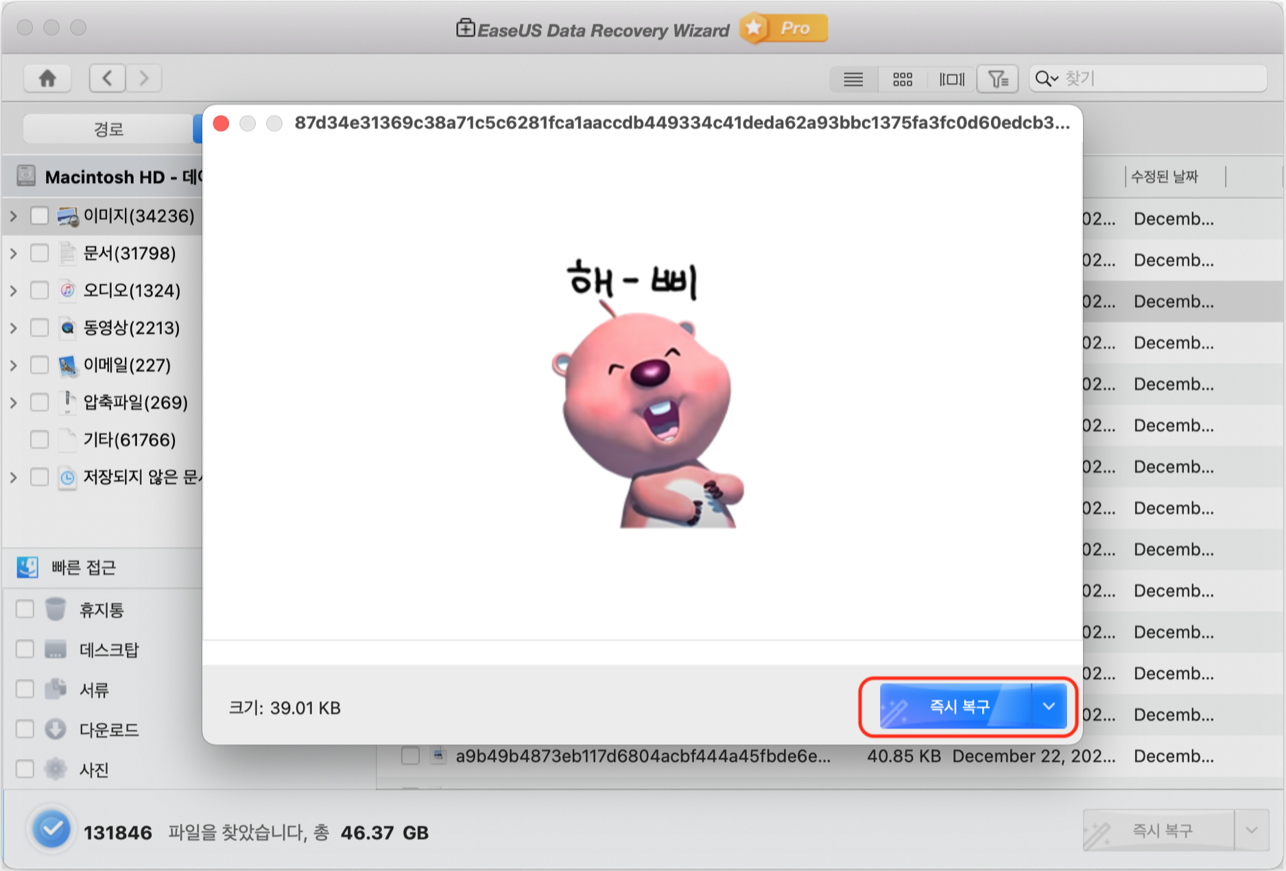 저는 삭제했던 루피 파일을 복구하려고 합니다. 미리보기를 통해 복구할 파일들을 확인하고 즉시 복구 버튼을 클릭합니다. 여기서 주의할 점! 은 이미 손상이 간 드라이브를 다시 선택해서는 안된다는 점이에요. 손상되었을지도 모를 드라이브에 다시 복구해서 저장해봤자 제대로 저장이 안될테니까요.