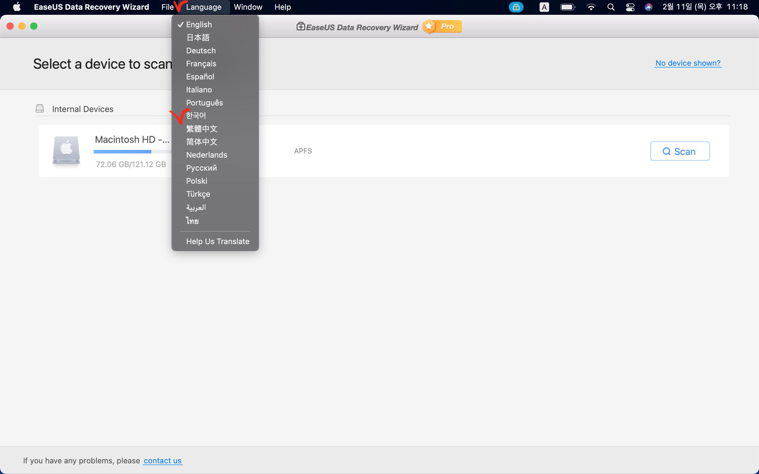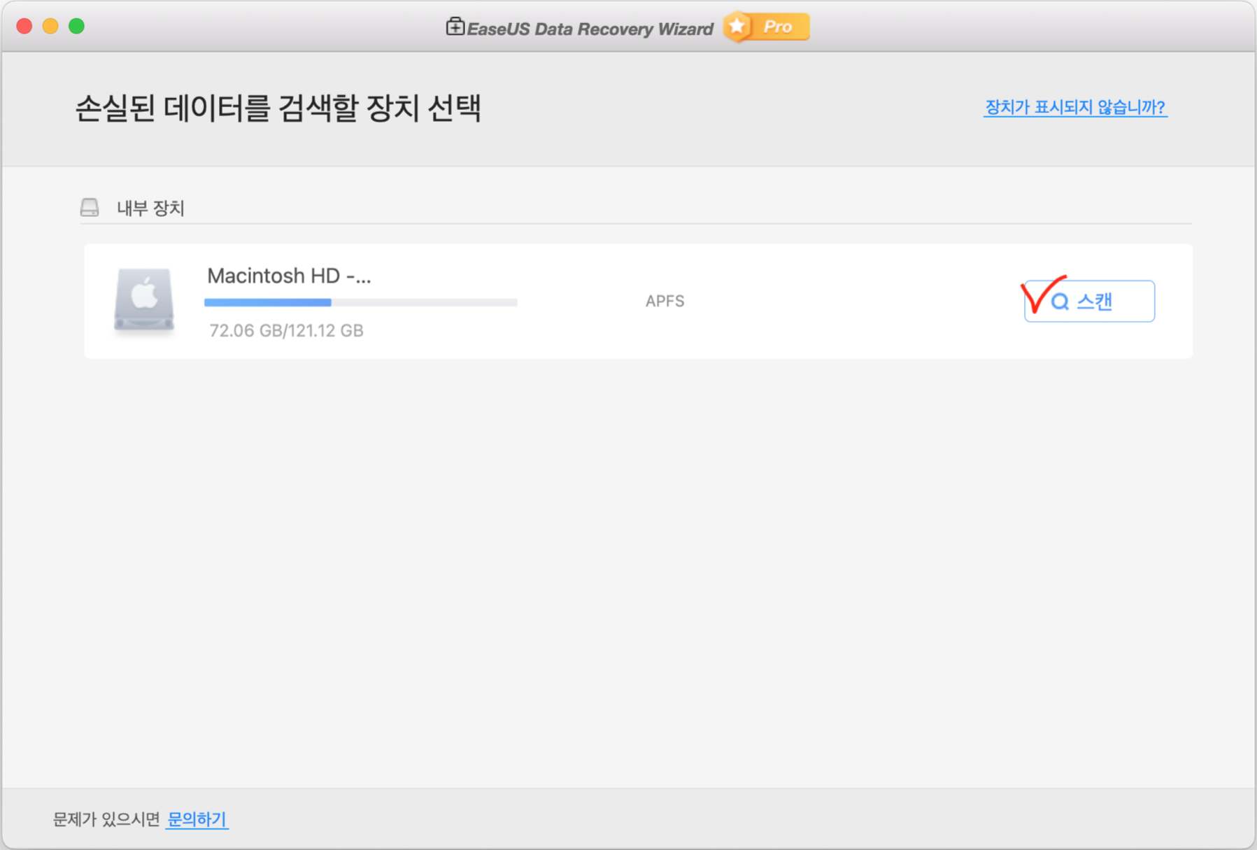 저는 파티션을 나누지 않았기 때문에 Macintosh HD 하나의 드라이브만 확인됩니다. 손상된 파일이 있는 드라이브의 스캔버튼을 클릭합니다.
