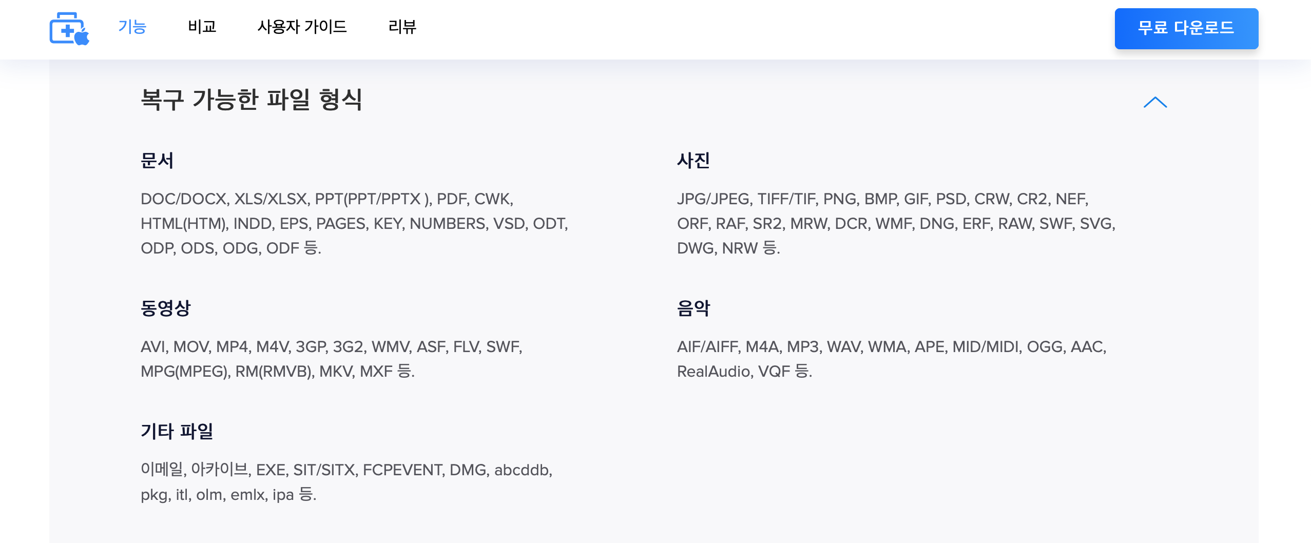 복구 가능한 파일 형식 및 저장장치