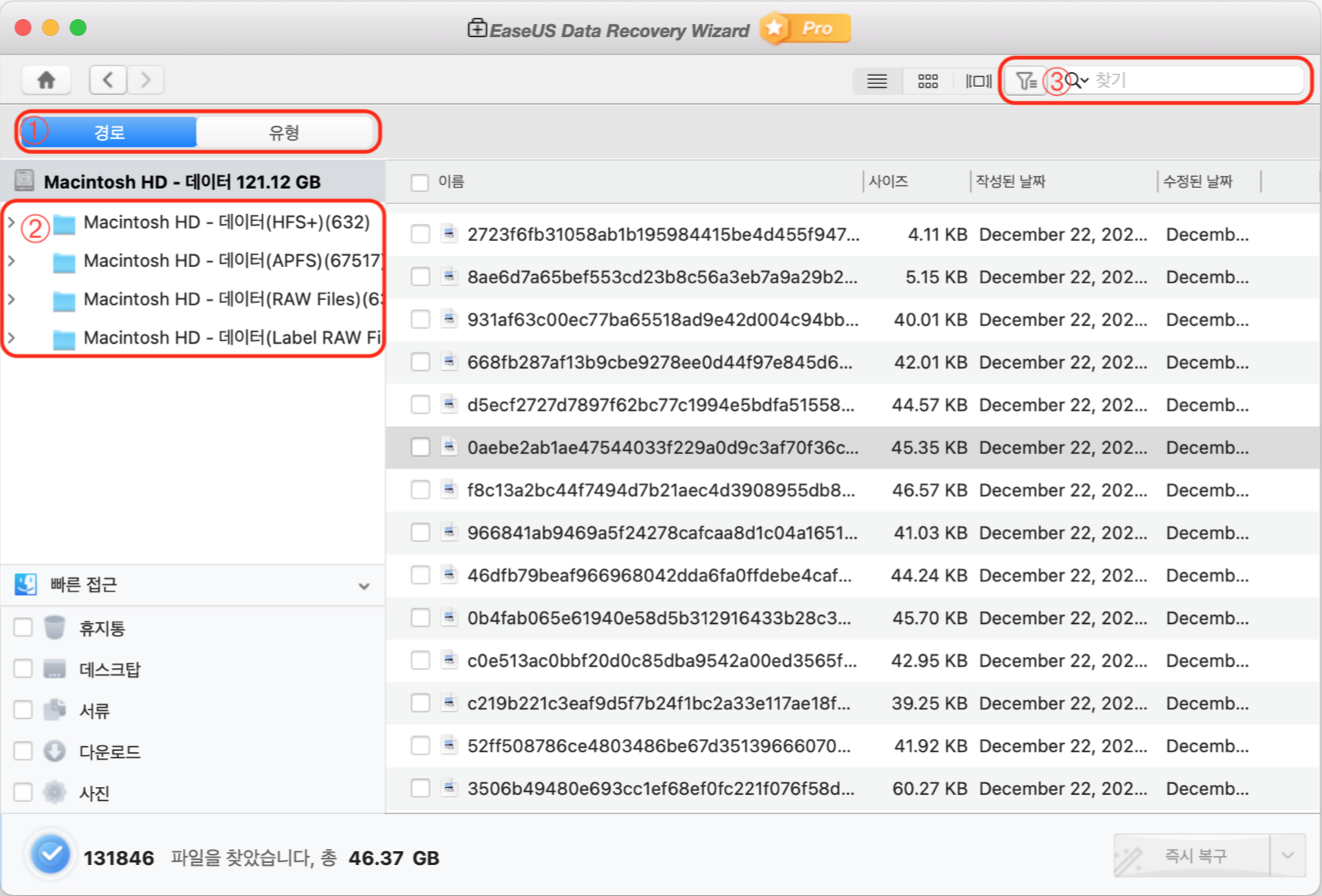 ③ 필터 : 필터 기능을 사용하면 많은 스캔 결과에서 복구하고자하는 데이터를 빠르게 찾을 수 있습니다.