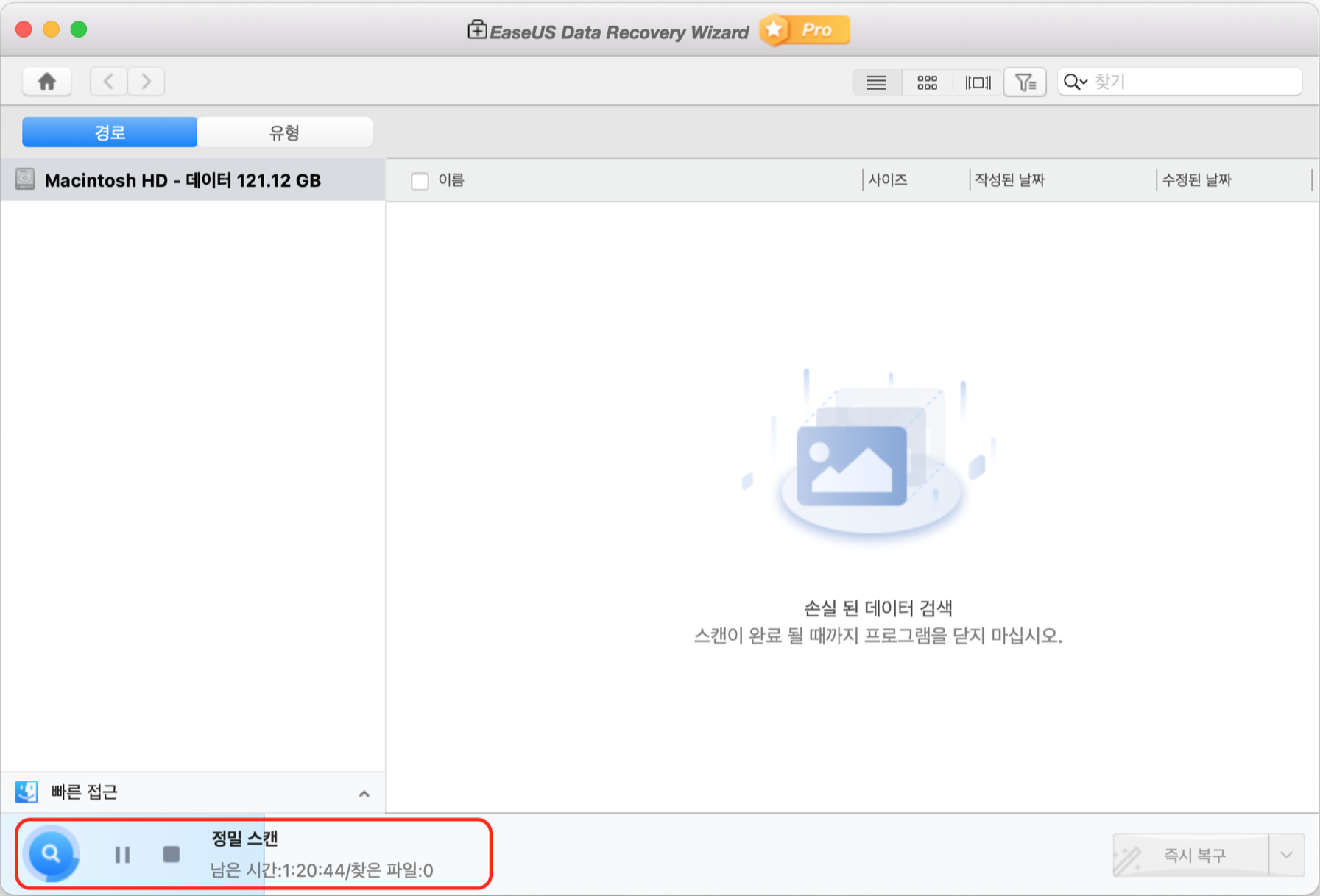 선택한 드라이브 또는 장치를 검색하는 단계입니다. 먼저 빠른 스캔으로 삭제된 파일을 찾고, 정밀 스캔으로 모든 파일을 철저하게 검색합니다.