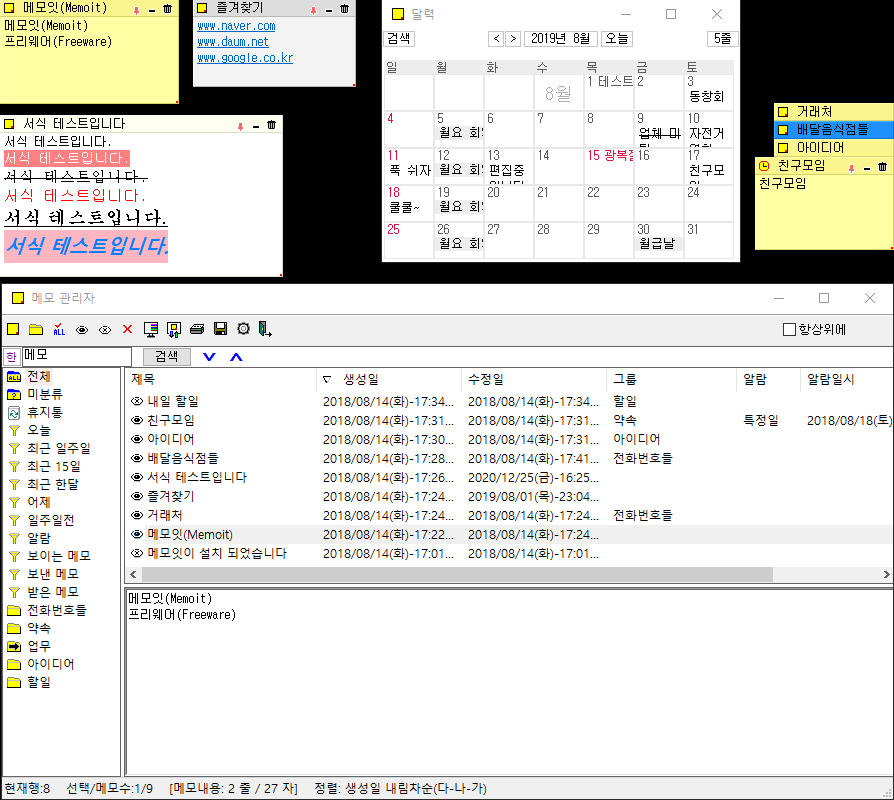 아래 사진처럼 메모뿐만 아니라 캘린더도 확인할 수 있고, 서식도 설정할 수 있습니다. 또한 메모 관리자를 통해 흩어진 메모들을 정리할 수 있습니다.