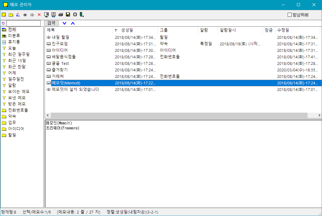 메모관리자에서 그룹(폴더) 분류가 가능하며 필터기능으로 오늘, 어제, 1주일, 한달, 기간범위 등의 기간별 분류와 보이는 메모, 알람 메모, 잠금 메모 등의 속성별로 분류가 가능하고 휴지통도 지원합니다.