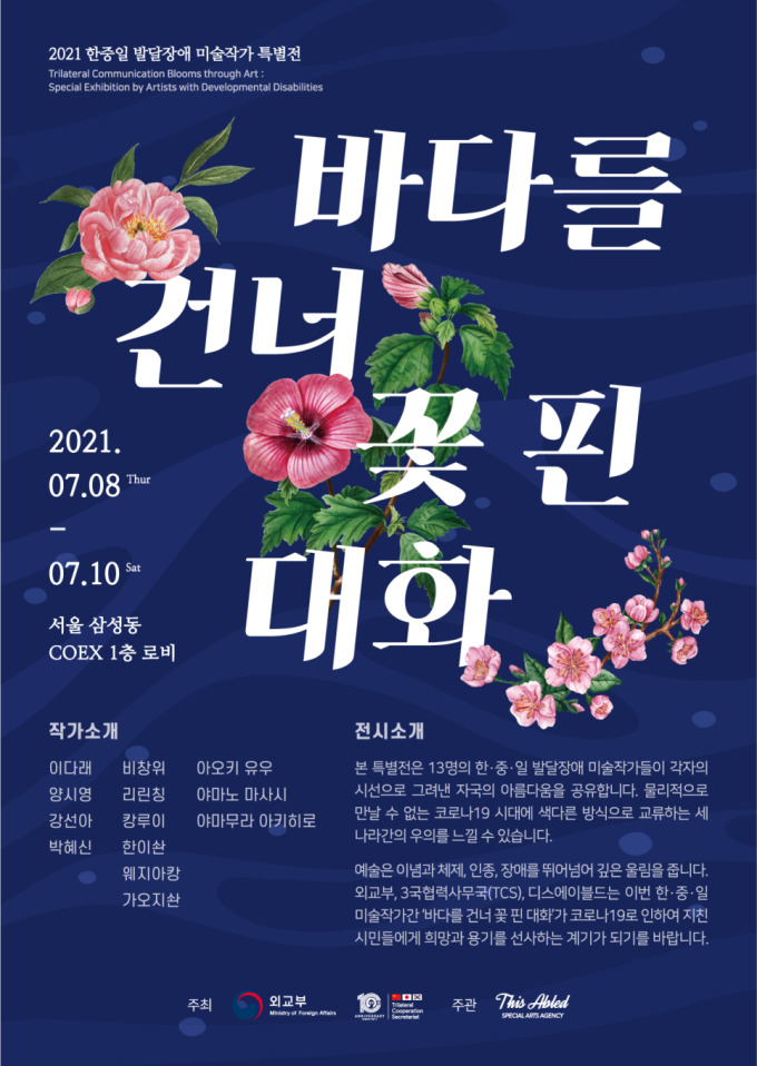 본 특별전은 13명의 한, 중, 일 발달장애 미술작가들이 각자의 시선으로 그려낸 자국의 아름다움을 공유합니다. 물리적으로 만날 수 없는 코로나19 시대에 색다른 방식으로 교류하는 세나라간의 우의를 느낄 수 있습니다. 예술은 이념과 체제, 인종, 장애를 뛰어넘어 깊은 울림을 줍니다. 외교부, 3국협력사무국, 디스에이블드는 이번 한, 중, 일 미술작가간 '바다를 건너 꽃 핀 대화'가 코로나19로 인하여 지친 시민들에게 희망과 용기를 선사하는 계기가 되기를 바랍니다.