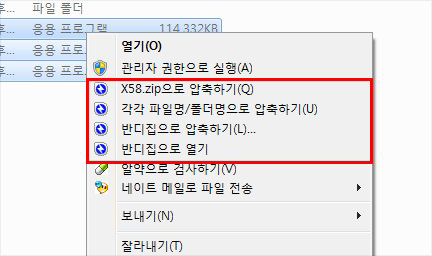 만약 여러 개의 파일이나 폴더를 선택해 압축하는 경우, 이를 하나의 파일로 합치지 않고 폴더별, 혹은 파일별로 압축해야 할 때도 있다. 이 때는 마우스 오른쪽 클릭 메뉴에서 '각각 파일명/폴더명으로 압축하기'를 선택하면 된다.