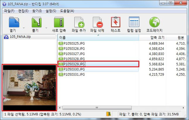 반디집의 내부 탐색기에서 썸네일 방식으로 사진 파일을 확인할 수 있다