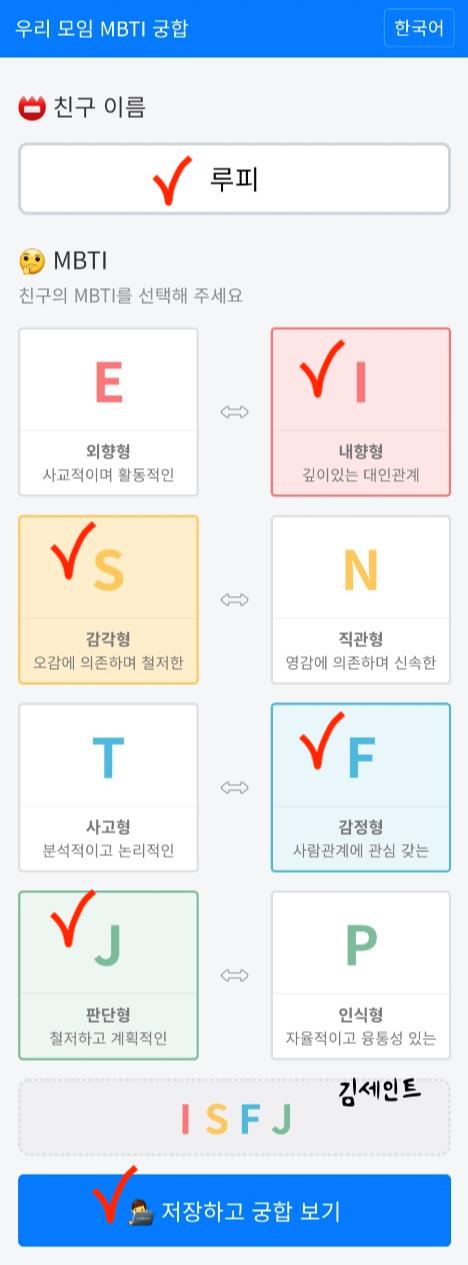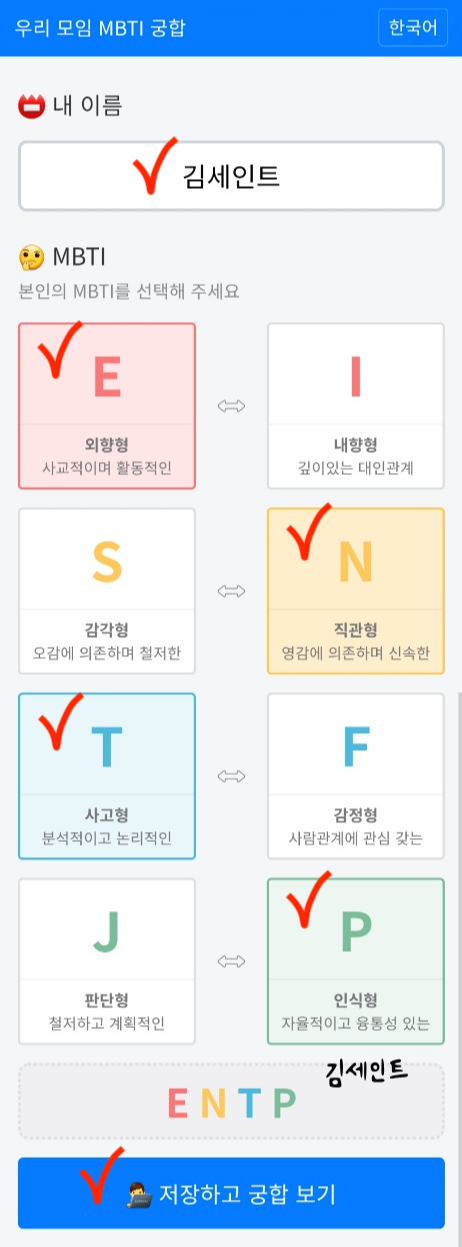 본인 이름을 쓰고 MBTI를 선택합니다. 이후 [저장하여 궁합보기] 를 선택합니다.
