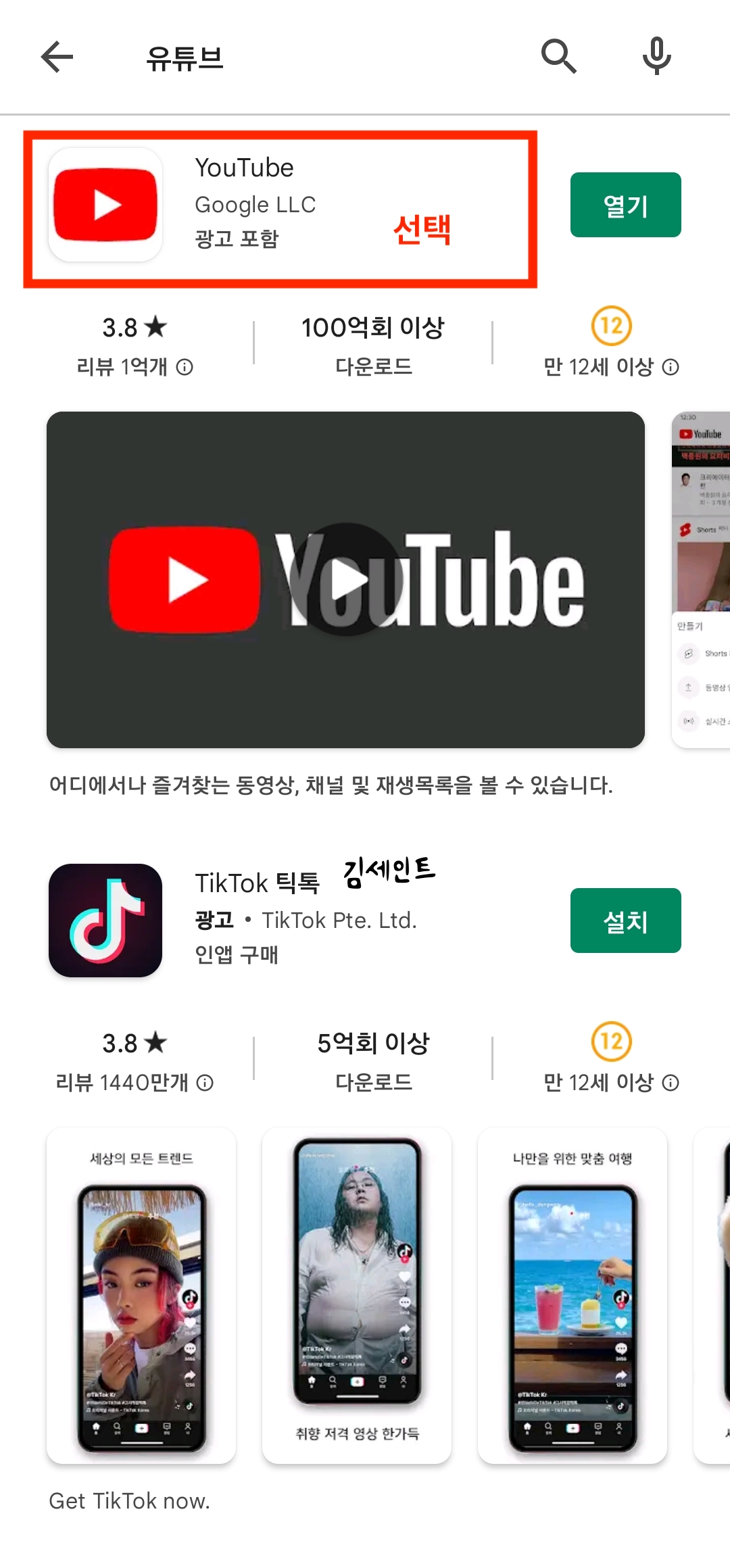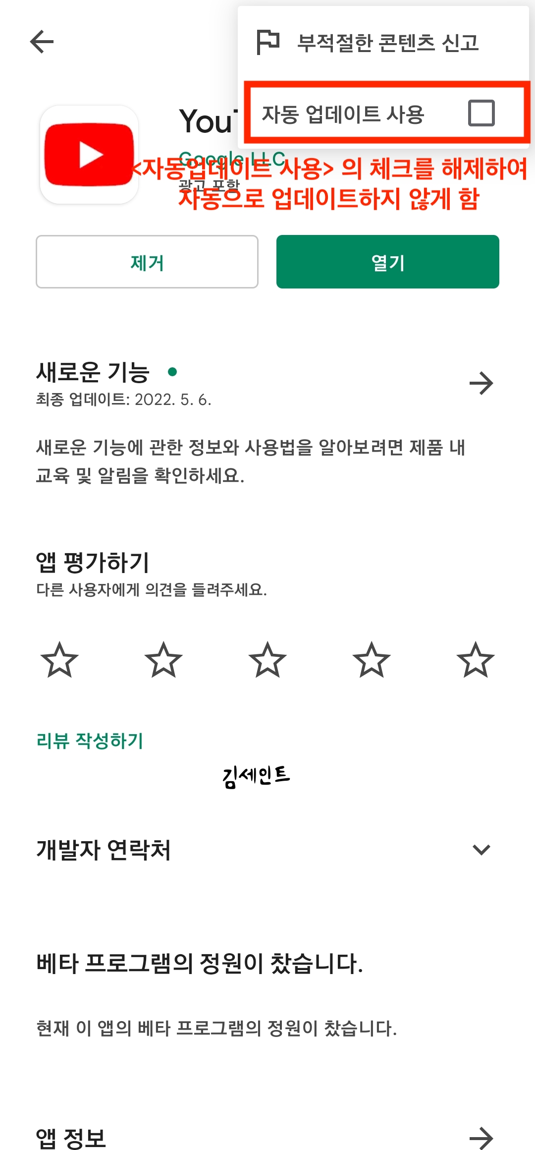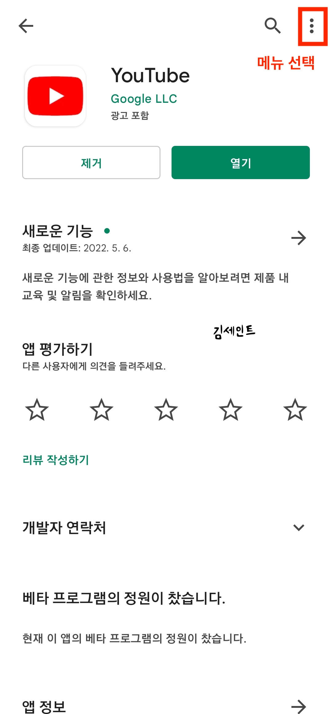 3) 구글 플레이어스토어 접속 > 유튜브 검색 > 상단 점3개 메뉴 선택
