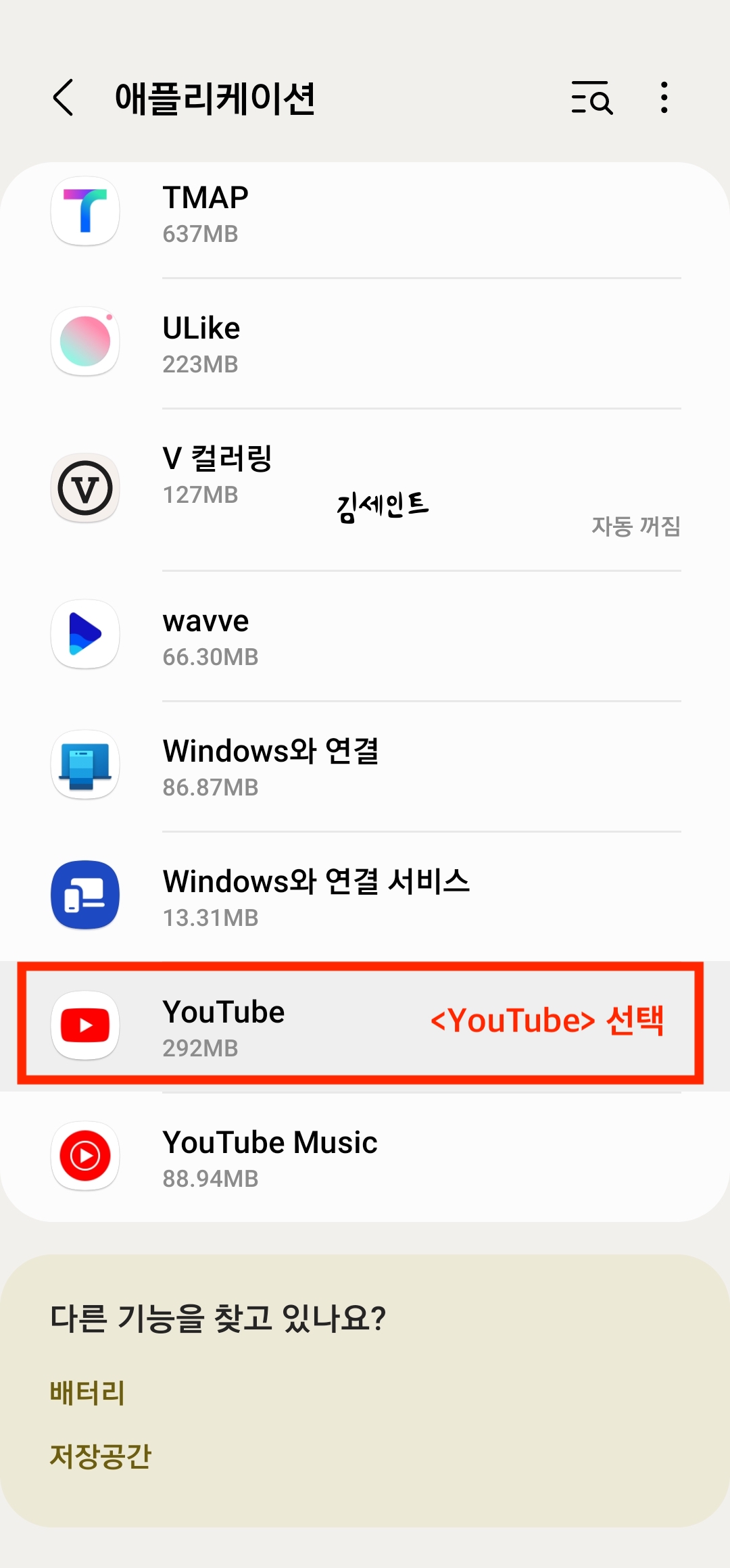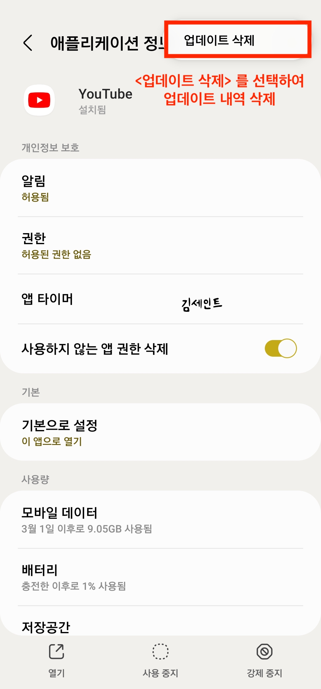 1) 설정 > 애플리케이션 > 유튜브 검색 > 우측상단 점3개 메뉴 선택