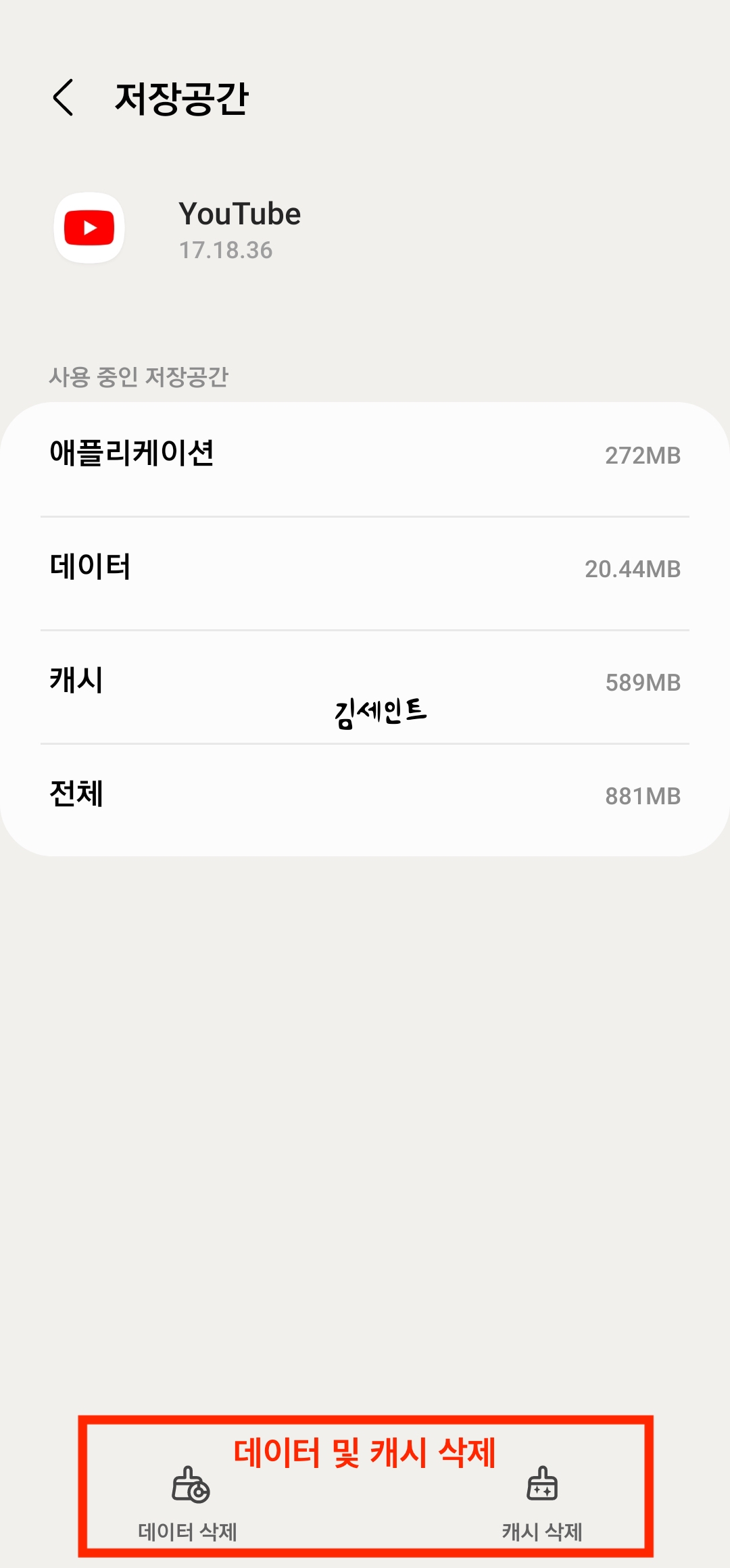 1) 설정 > 애플리케이션 > 유튜브 > 저장공간 선택