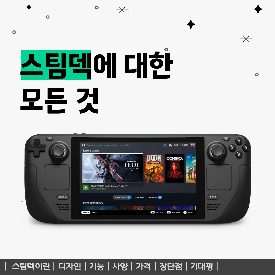 스팀덱은 이동식 게임 콘솔 기기로, PC와 비슷한 성능을 가지며 다양한 게임을 실행할 수 있습니다.