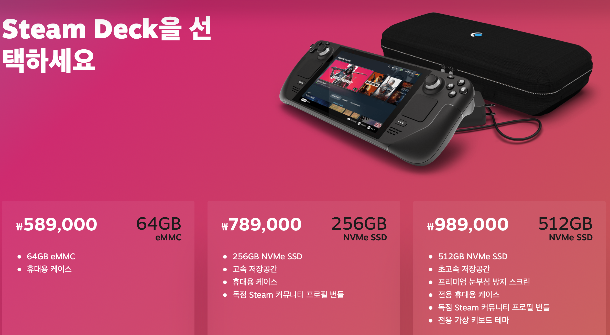 스팀덱의 가격은 기본 모델이 399달러, 확장형 모델이 529달러입니다. 한화로는 51만 7천원, 68만원 정도 되겠습니다.