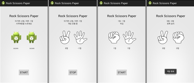시작 화면에서 START 버튼을 누르면 1초에 한 번씩 가위바위보를 하며 게임이 진행된다. STOP 버튼을 누르면 게임종료 팝업이 뜨고 점수가 상단에 뜨면서 결과를 알려준다.